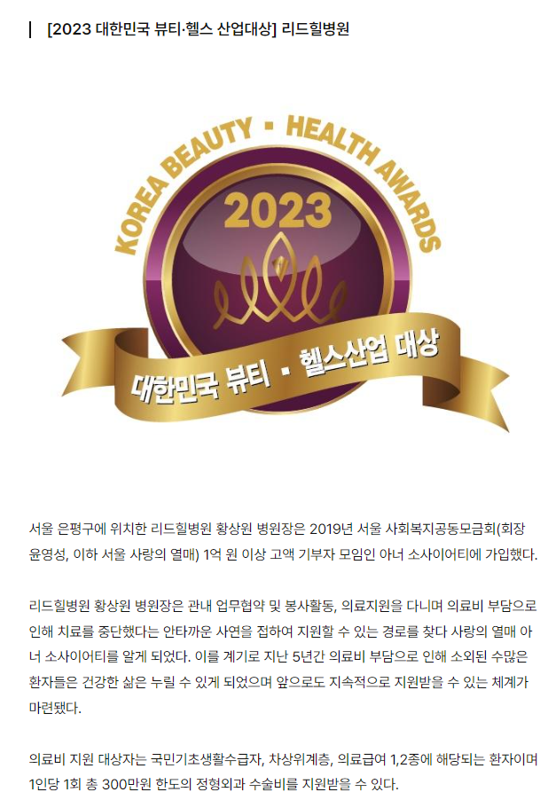 2023 대한민국 뷰티·헬스 산업대상] 리드힐병원 _한국일보